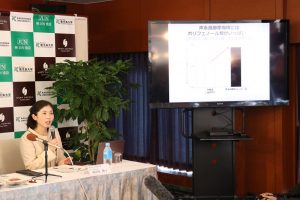研究成果を説明する加治屋講師 新商品を手にする東代表(中央)と加治屋講師