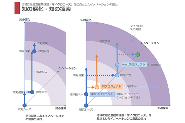 今回の評価の対象となったのは、「地域に眠る潜在的課題「マイクロニーズ」を起点としたイノベーションの創出」事業。マイクロニーズとは、地域の人々にとっては自然で当然な事象であり、課題として認識されていなかったが、地域外の観察者により明確に課題として認識され、かつその解決過程でイノベーションが期待される潜在的課題のことです。同事業では、研究者が自らの研究成果を突き詰めていく「知の深化」、同センターが様々な手法を用いてマイクロニーズを発掘する「知の探索」を組み合わせ、新たなイノベーションへとつなげてきました。これは地域に限らず研究者にとっても、研究資金の獲得や新たな研究成果へと発展しやすくなるメリットがあり、実際に、2021年度末の南九州・南西諸島域における共同研究・受託研究の契約数は、2010年度から2015年度の平均の2倍以上へと増加する成果を上げました。