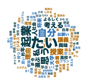 この図は、第一回目の講義後に学生から集めた「本講義を受講した理由」を基に作成したワードクラウドです。ワードクラウドはテキスト文章にある単語の出現頻度を可視化したものです。